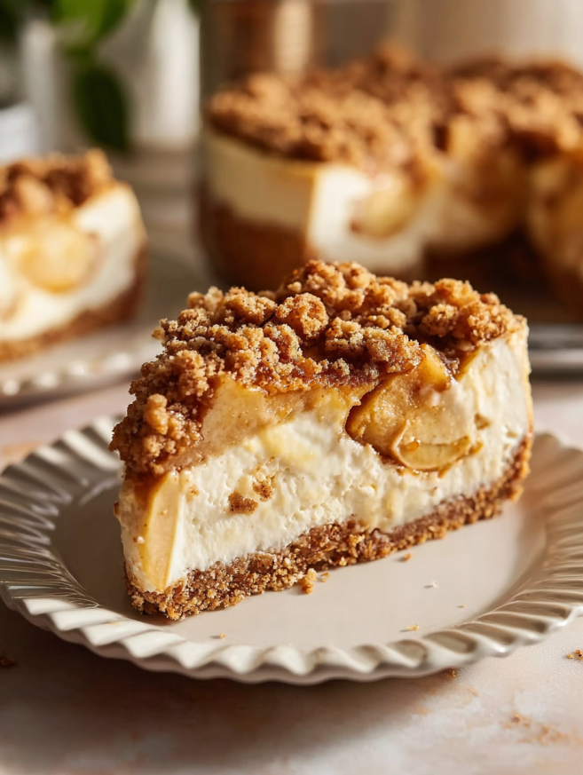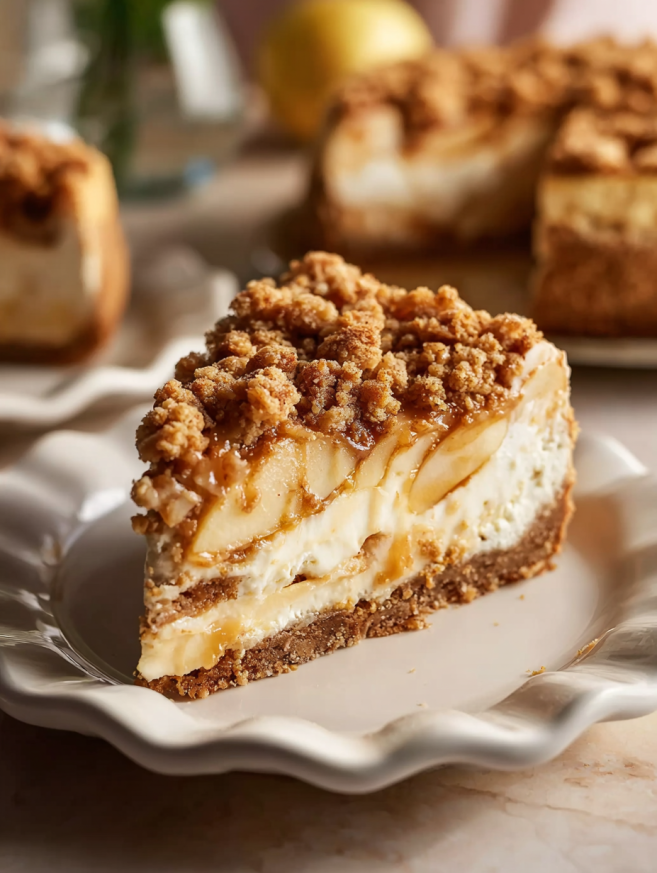 Slice the cheesecake with a sharp knife that’s been dipped in hot water and wiped dry between each cut. This creates clean, professional-looking slices that showcase all those beautiful layers. Serve on white plates to let the colors of the apples and crumble shine.