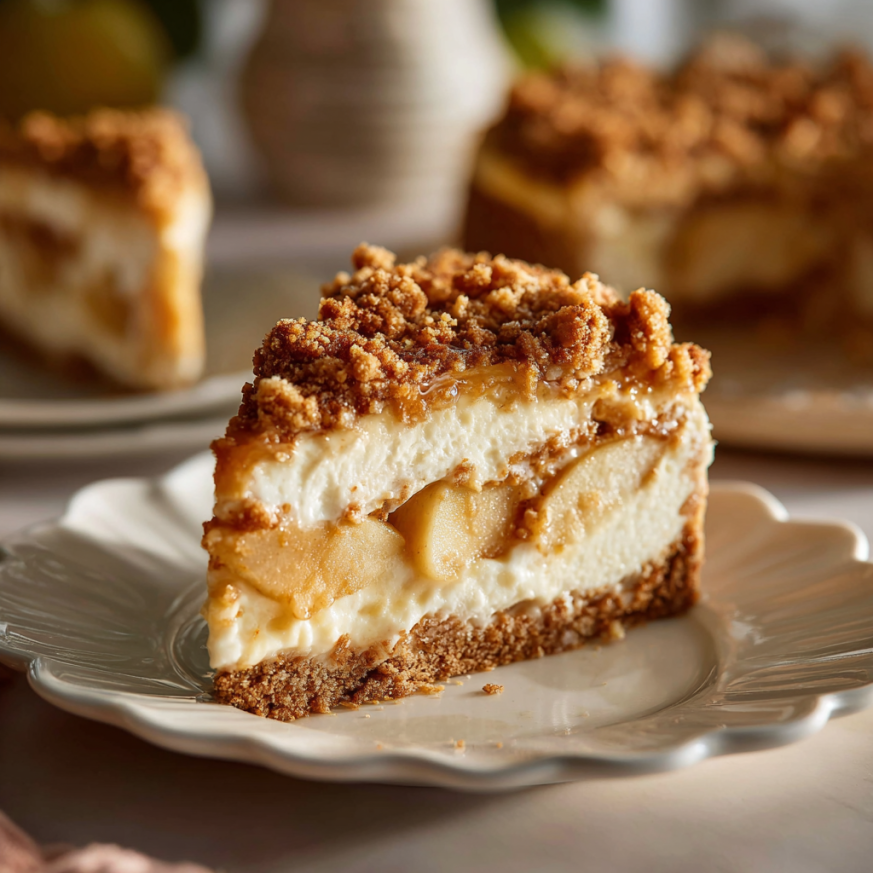 Slice the cheesecake with a sharp knife that’s been dipped in hot water and wiped dry between each cut. This creates clean, professional-looking slices that showcase all those beautiful layers. Serve on white plates to let the colors of the apples and crumble shine.