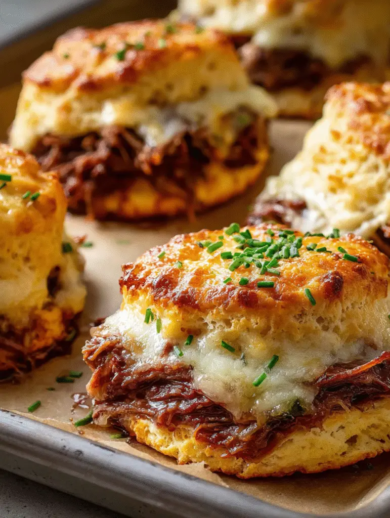 Arrange the warm biscuits on a serving platter and place the bowls of hot au jus alongside them. Encourage everyone to tear or cut their biscuit and dunk it into the savory broth. The combination of flaky, herb-scented biscuit, tender beef, melted cheese, and rich broth creates an unforgettable eating experience.