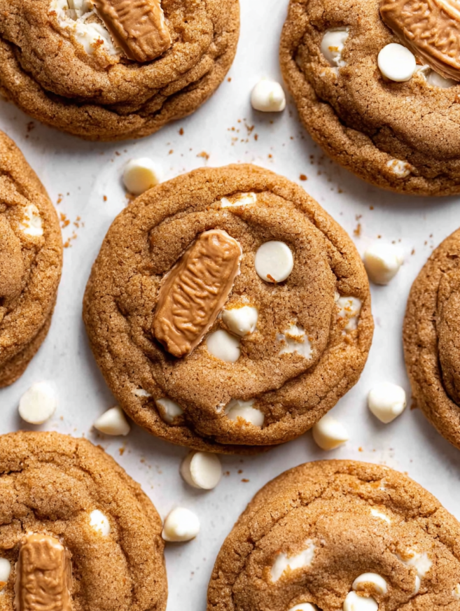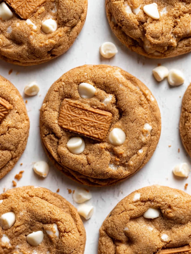 The texture is absolutely perfect—crispy edges give way to soft, chewy centers loaded with melty white chocolate and crunchy Biscoff pieces. Each bite offers multiple textures and flavors, making these cookies far more interesting than your standard chocolate chip variety.