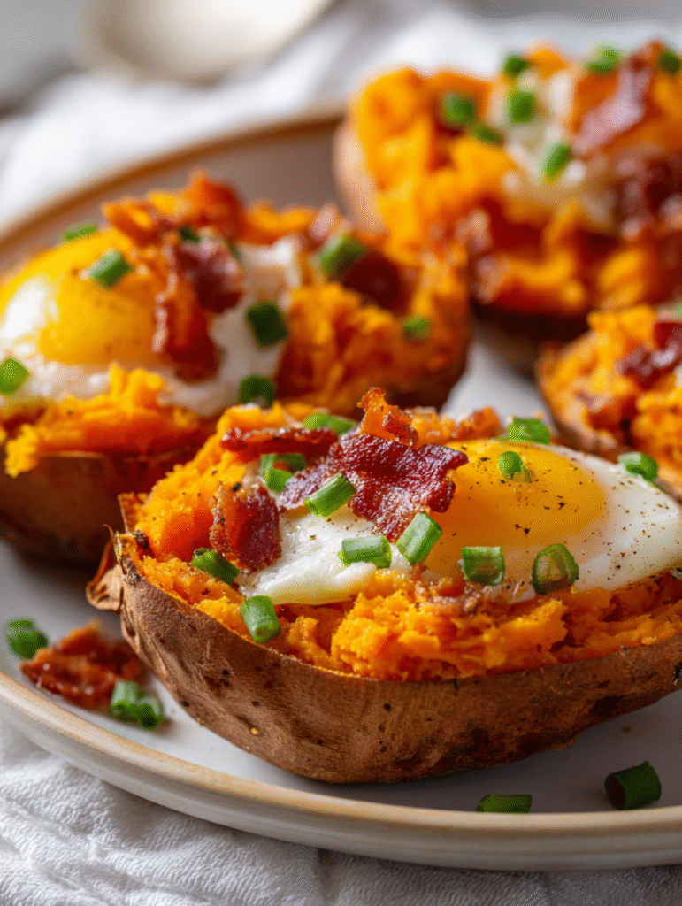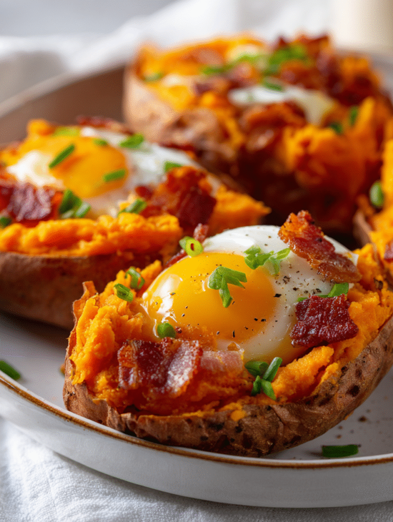Picture soft, tender sweet potatoes baked until their skins are slightly crisp and rich in orange-glow, then hollowed and filled with warm butter, savory bacon, gooey cheddar-cheese, and topped with a gently baked egg that bursts its golden yolk. Every bite is a comforting melody of silky sweet potato flesh, smoky bacon crunch, melted cheese warmth, and eggy richness. This breakfast dish elevates the humble sweet potato into something special—perfect for a weekend brunch, a cozy Sunday morning, or anytime you want a hearty, satisfying start. It’s warm, homey and brimming with flavor.
