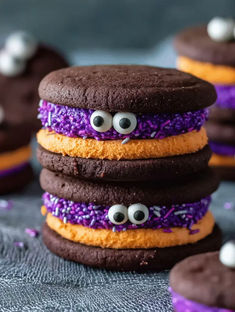 These Chocolate Monster Halloween Cookies became an instant hit, not just with the kids but with every adult who saw them. The beauty lies in their imperfect perfection – each cookie sandwich sits at a playful angle, creating unique monster personalities that make everyone smile. What started as a last-minute solution has become my most requested Halloween recipe, loved for both its charming appearance and incredible taste.