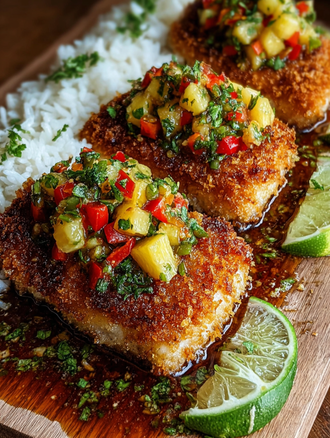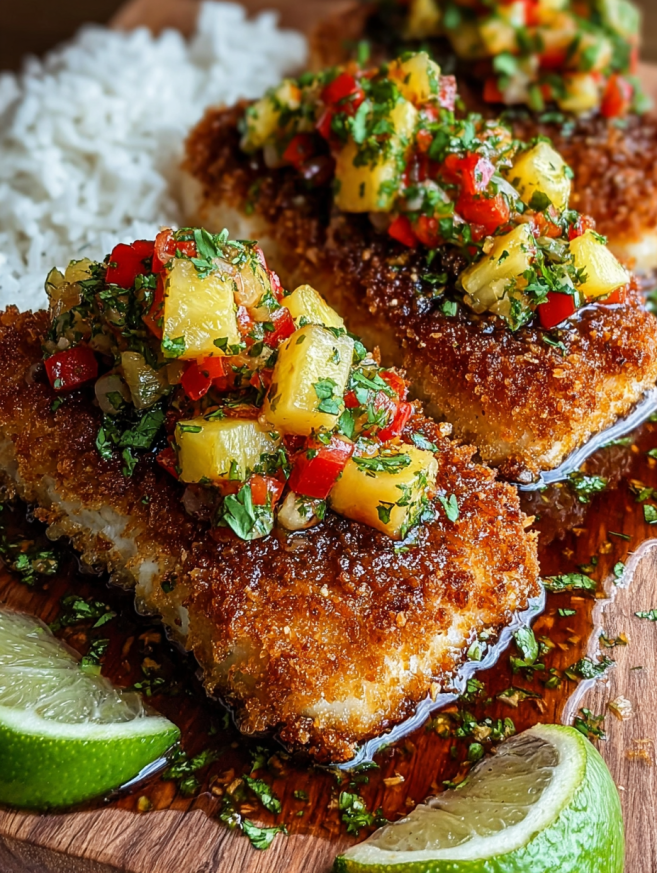 Replace the pineapple salsa with a mango-cucumber salsa and add sesame seeds to the coconut crust. Drizzle with a sweet chili sauce or sriracha mayo for heat. This variation brings Southeast Asian flavors to the forefront while maintaining the crispy coating everyone loves.
