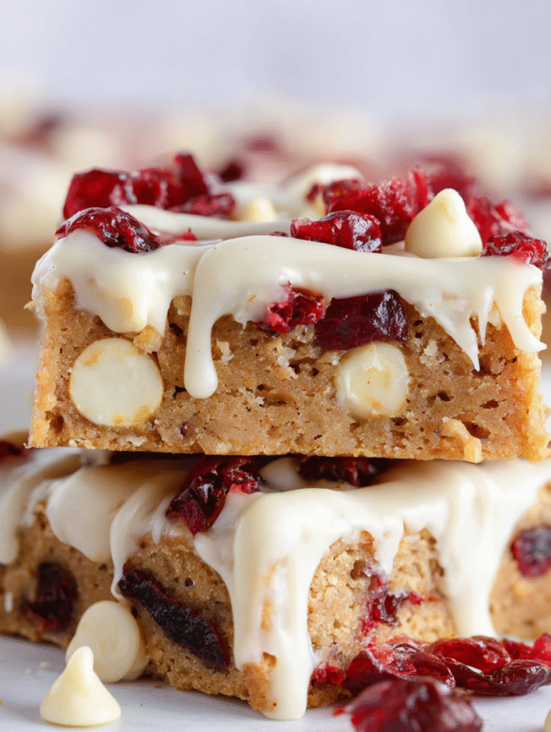 There are cakes, there are cookies … and then there are bars that feel like a little slice of holiday magic. Imagine a soft, chewy blondie base infused with buttery brown sugar richness and studded with tart dried cranberries and creamy white chocolate chips. Then imagine that topped with a tangy-sweet cream cheese frosting, sprinkled with more cranberries and drizzled with melted white chocolate. That’s exactly what these bars bring to your table.