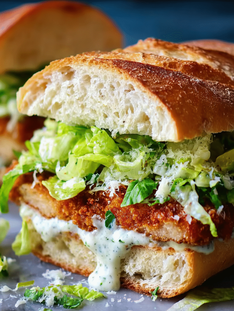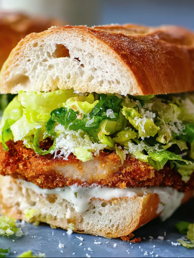 Perfect Balance of Textures and Flavors The contrast between crispy chicken, creamy dressing, crunchy romaine, and crusty bread creates a symphony of textures in every bite. Additionally, the tangy Caesar dressing perfectly complements the savory breaded chicken.