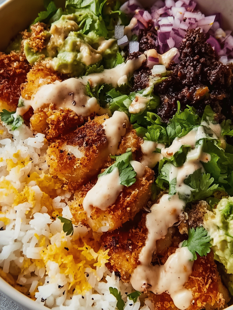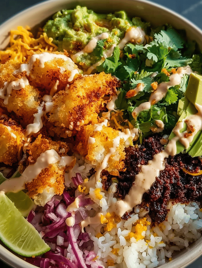 The magic happens when perfectly seasoned crispy fish meets fresh, zesty slaw and creamy chipotle sauce, all nestled over a bed of fluffy rice. Each bite delivers a symphony of textures and flavors that transport you straight to your favorite coastal taco shop – except these are actually better because you control every delicious detail.