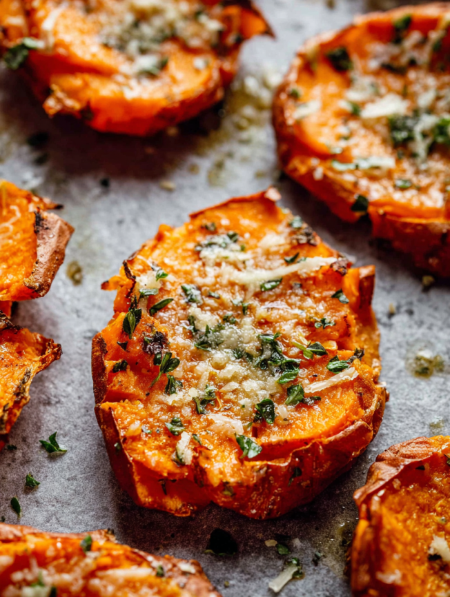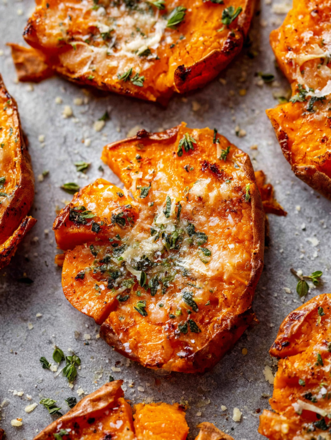 Garlic Butter Smashed Sweet Potatoes With Parmesan Cheese