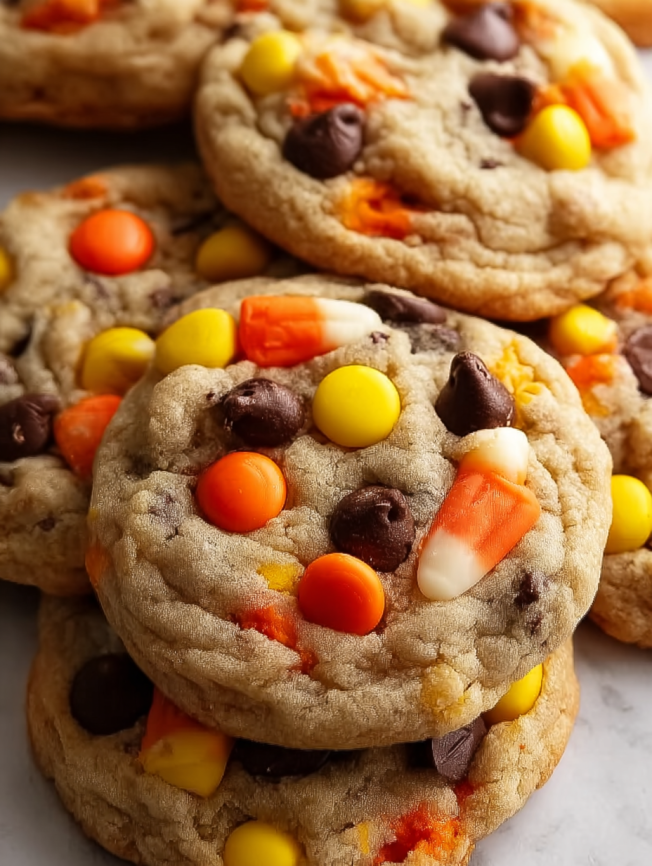 Replace candy corn with a mixture of Halloween M&Ms, Reese’s Pieces, and mini marshmallows. This creates a colorful, chunky cookie that’s loaded with different textures and flavors in every bite.