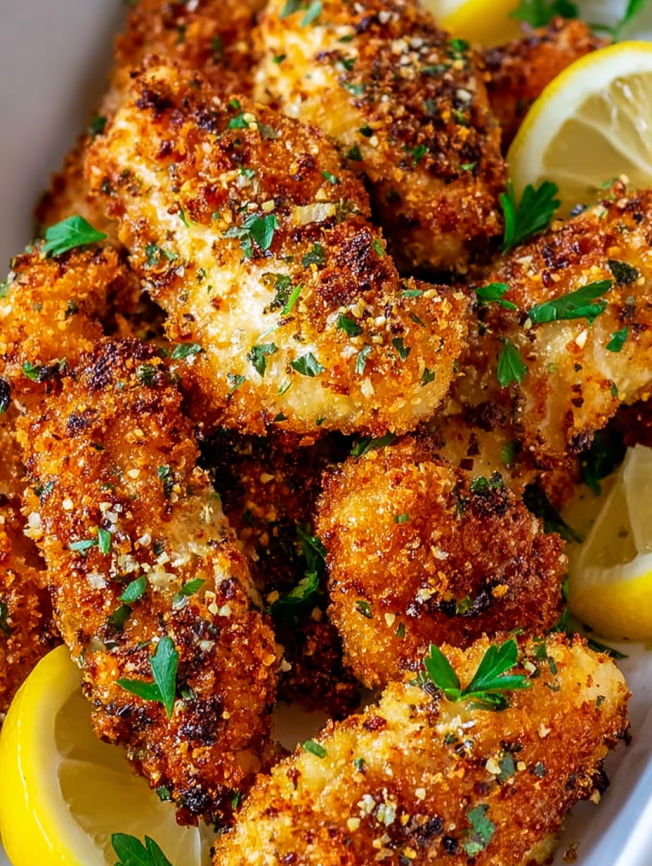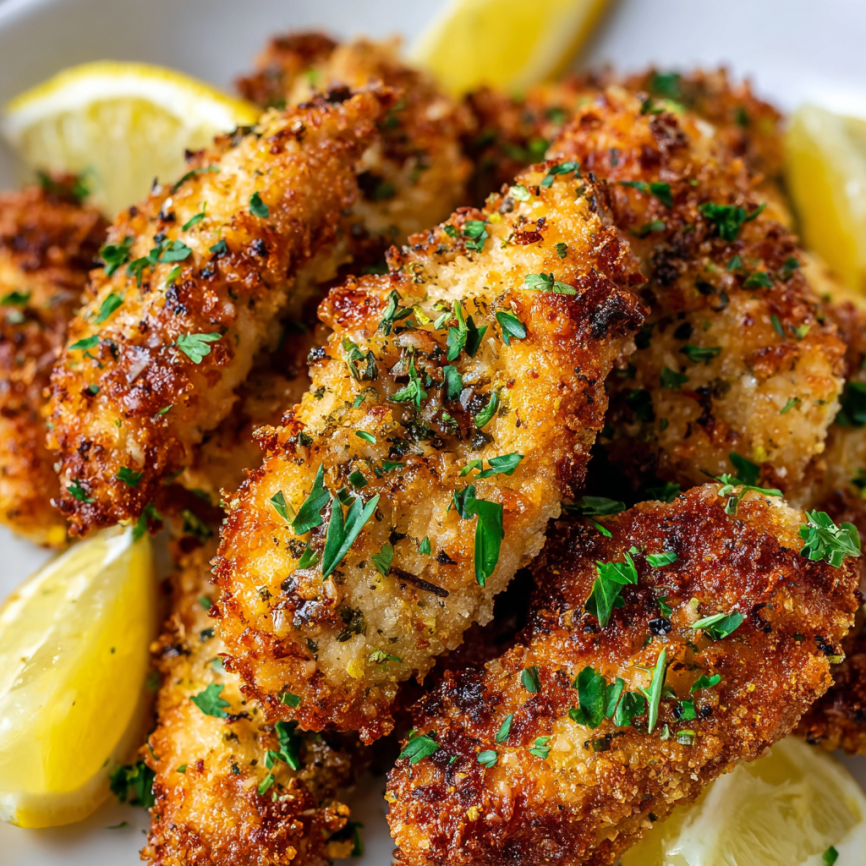 Once your tenders are perfectly golden and cooked through, transfer them to a serving platter. While they’re still hot, drizzle the fresh lemon juice over the tenders and sprinkle with chopped parsley for a pop of color and freshness. For extra indulgence, add a final sprinkle of parmesan cheese.