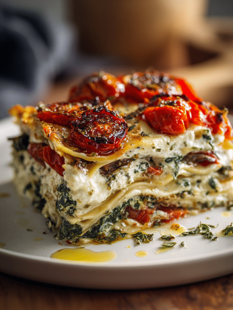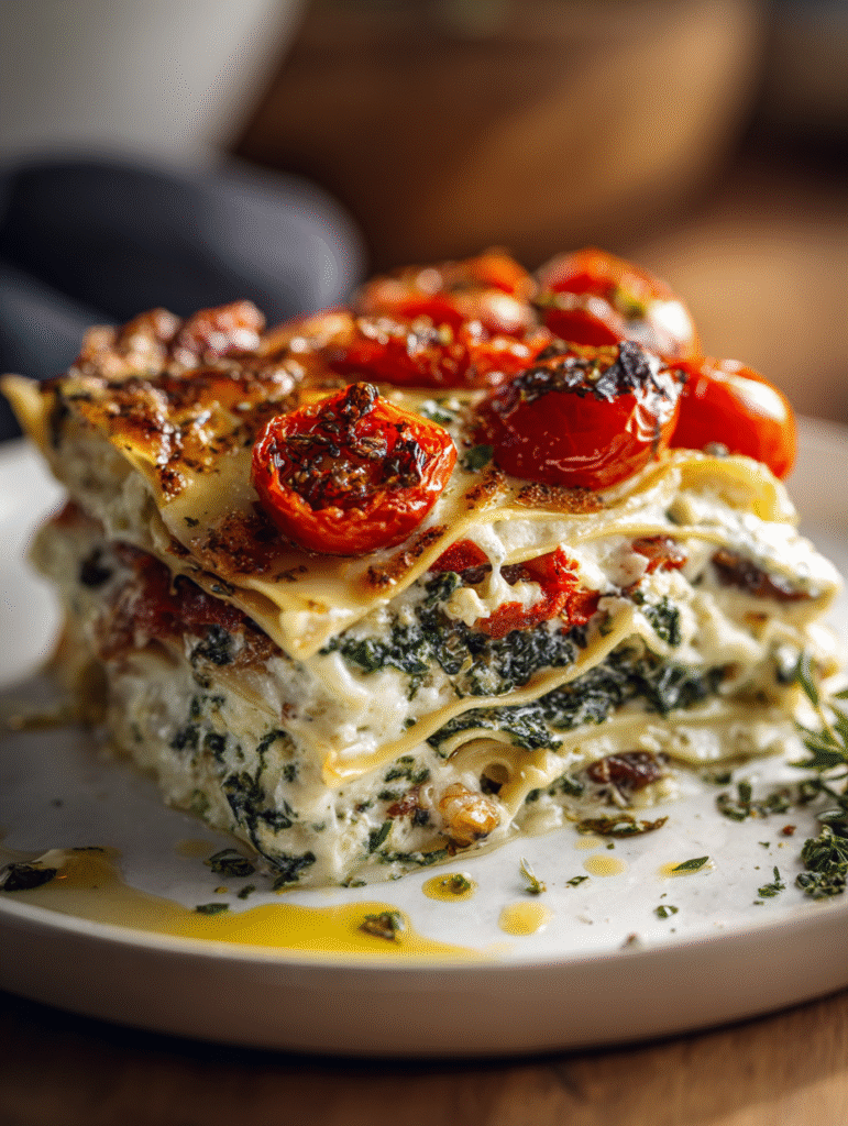 As you roast or sauté the zucchini, eggplant, spinach, maybe mushrooms, you’ll smell that subtle sweetness from the veggies and the soft garlic and onion notes. When the white sauce begins to bubble in the oven and the cheese forms a golden hood over the top, you’ll feel like dinner is an event, not just a meal. Whether you’re serving it on a quiet weeknight or making it for a gathering, this lasagna offers richness without heaviness, and comforting warmth without meat. It’s vegetarian—but indulgent.