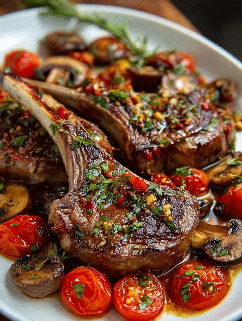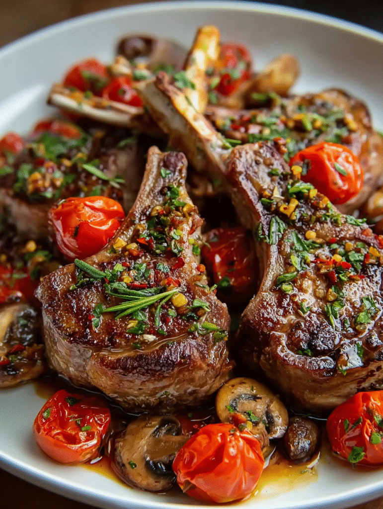 For a more refined presentation, plate each portion individually. Place two lamb chops slightly overlapping on each plate, spoon the mushrooms and tomatoes alongside, and drizzle with the pan sauce. Add a lemon wedge and fresh herb sprig for a restaurant-worthy finish.