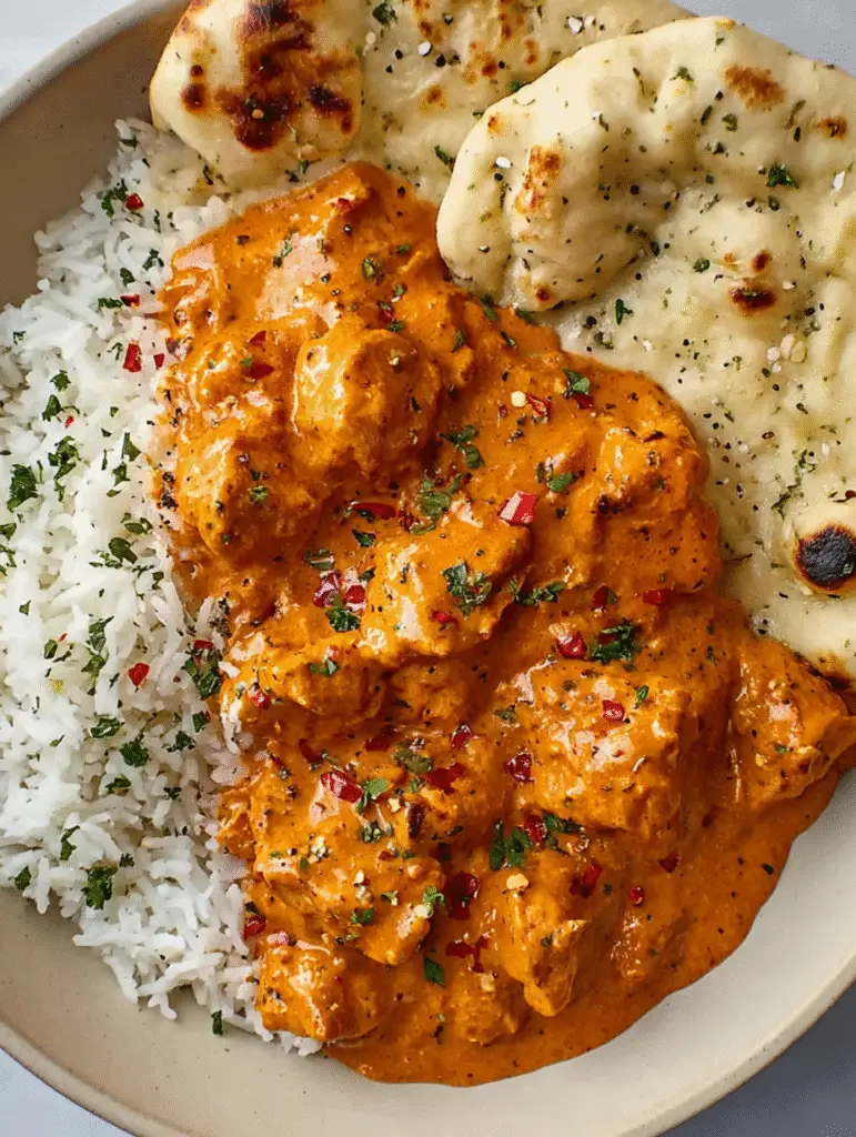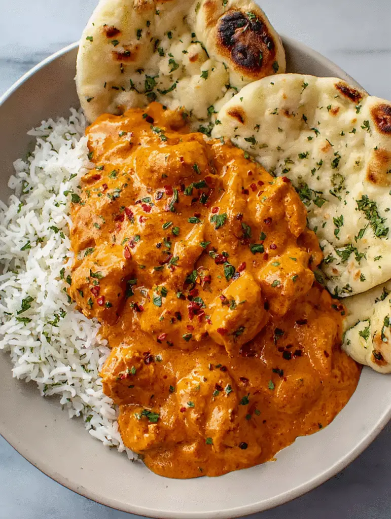Serve your homemade butter chicken hot alongside warm naan bread and fluffy basmati rice. The naan is perfect for scooping up the creamy sauce, while the rice provides a neutral base that absorbs all those incredible flavors.