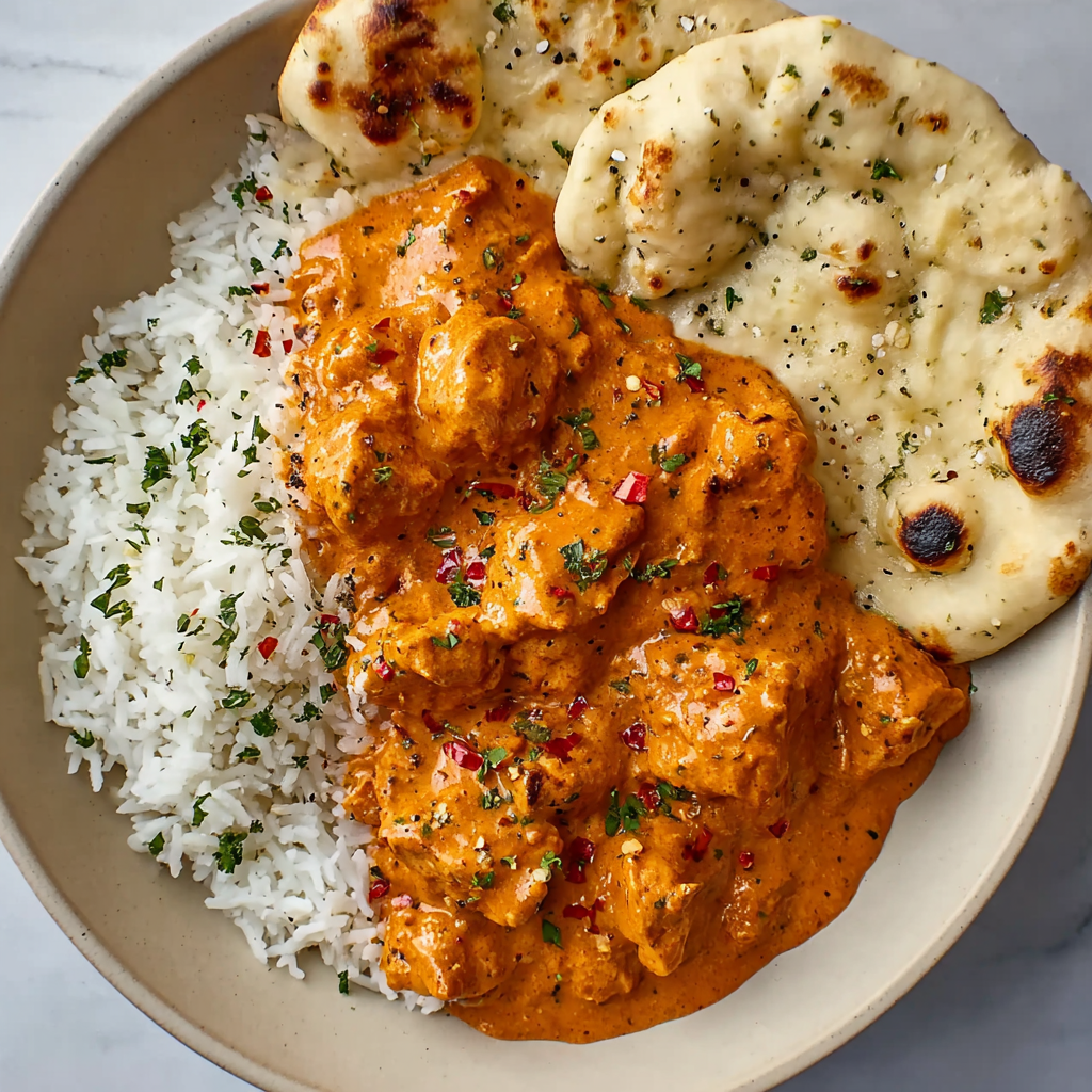 Serve your homemade butter chicken hot alongside warm naan bread and fluffy basmati rice. The naan is perfect for scooping up the creamy sauce, while the rice provides a neutral base that absorbs all those incredible flavors.