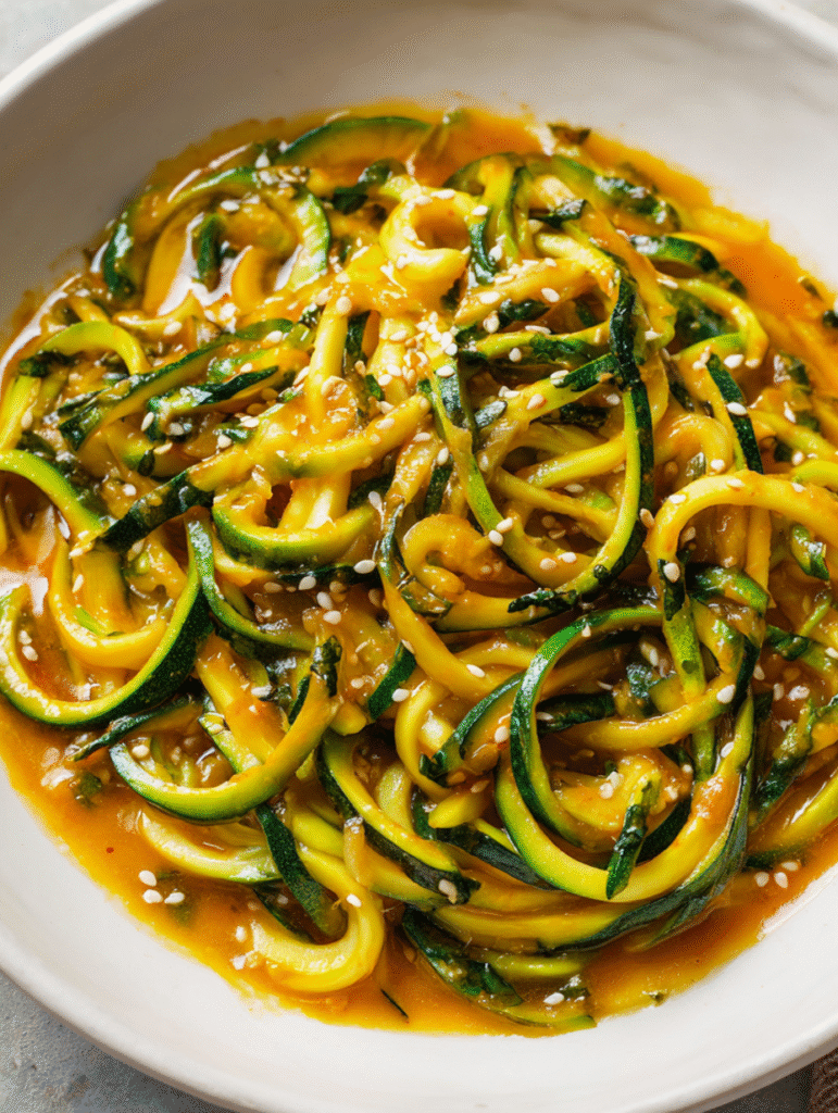 Imagine crisp, fresh spirals of zucchini tossed in a bold, nutty, chili-infused sauce that awakens your senses with each bite. This dish brings together the bright crunch of raw zucchini noodles (“zoodles”) and a spicy, savory dressing that’s both refreshing and deeply flavorful. It’s perfect for a light lunch, a vibrant side dish, or a healthy dinner when you want something chilled, clean, and full of punch. The heat of the chili powder or oil meets the smooth richness of tahini or nut-butter, creating an exciting contrast with the crisp zucchini and subtle sesame oil undertones.