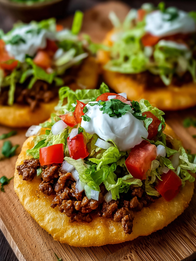 Place each warm piece of fry bread on an individual plate. Working quickly while the bread is still warm, layer with crisp lettuce, seasoned ground beef, diced tomatoes, and shredded cheese. The heat from the bread will begin melting the cheese slightly.