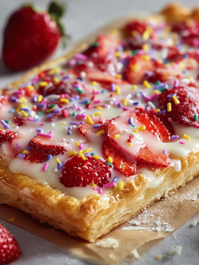 If you love the nostalgic sweetness of a toaster-style strawberry pop-tart, but want something bake-worthy and shareable, this Strawberry Pop Tart Slab Pie delivers in spades. A buttery, flaky homemade crust envelops a juicy strawberry filling that bursts with fresh flavour, and the whole pie is finished with a vanilla glazed icing and rainbow sprinkles — playful, comforting, and unforgettable. The contrast of crisp pastry, soft filling and sweet glaze makes it perfect for brunch, dessert or anytime you want something special.