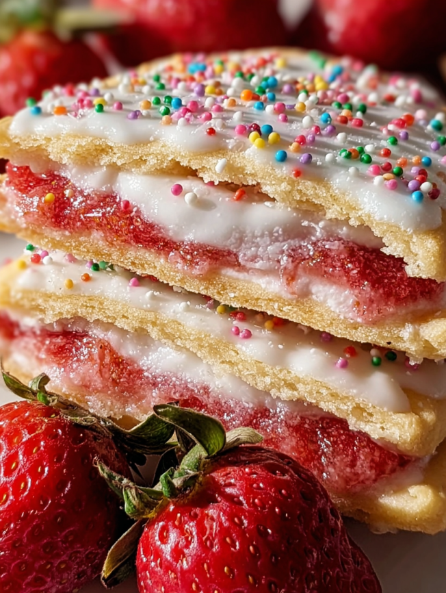 If you grew up eating Pop Tarts, these Strawberry Pop Tart Sugar Cookies will take you straight back to childhood. Imagine soft, buttery sugar cookies filled with sweet strawberry jam and topped with cheerful sprinkles. They mimic the taste and look of the classic breakfast pastry—but in a more decadent, homemade form.