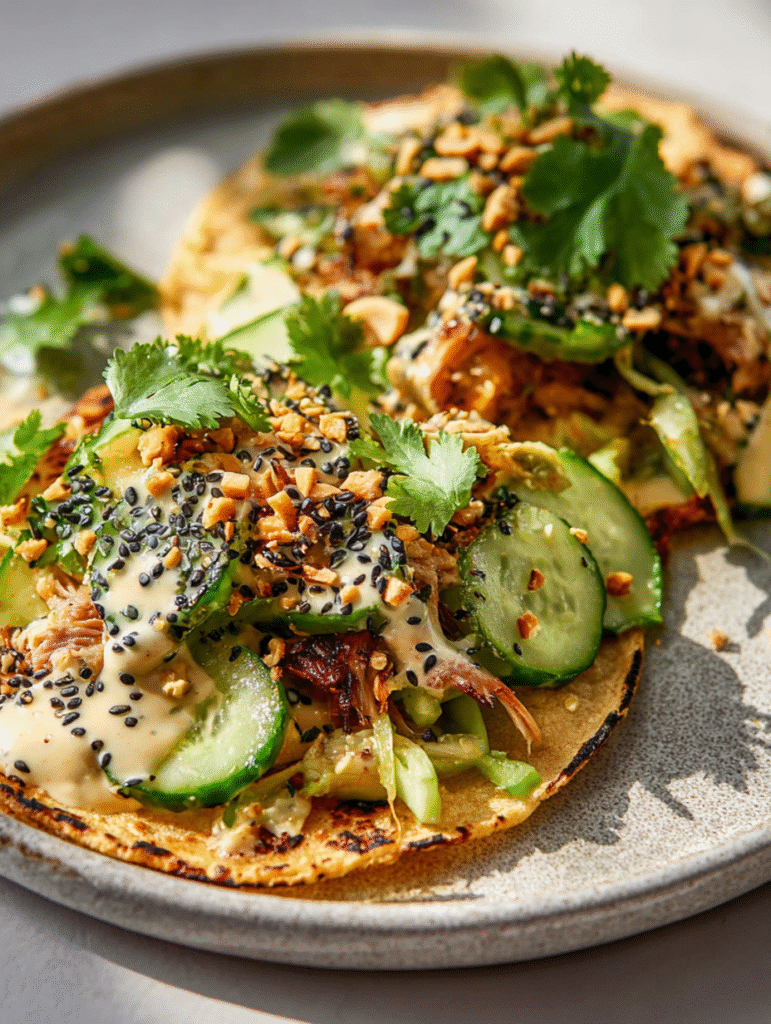 - Assemble the tacos: Layer each tortilla with a portion of teriyaki chicken, a generous scoop of cucumber slaw, a few slices of avocado, a sprinkle of sesame seeds (and peanuts/scallions if using).