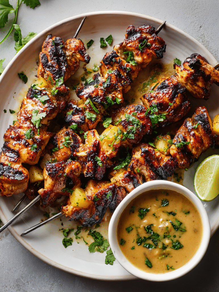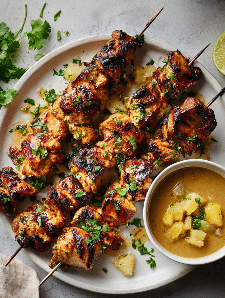 Serve these skewers with fragrant jasmine rice, coconut rice, or even rice noodles for a full meal. Add a side of steamed or grilled vegetables like bok choy, red bell pepper or zucchini. Garnish with fresh lime wedges and additional cilantro for brightness. A crisp green salad dressed in lime‑cilantro vinaigrette also complements the dish beautifully. For beverages, try a chilled sauvignon blanc or a lightly sweetened iced tea with lime.